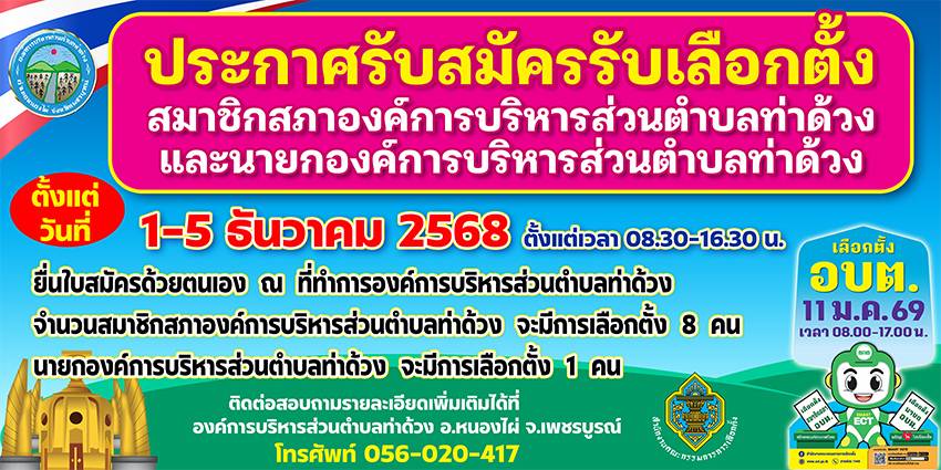 ประกาศรับสมัครเลือกตั้งสมาชิกสภาองค์การบริหารส่วนตำบลท่าด้วงและนายกองค์การบริหารส่วนตำบลท่าด้วง ระหว่างวันที่ 1 - 5 ธันวาคม 2568 ตั้งแต่เวลา 08.30 - 16.30 น. ณ ที่ทำการองค์การบริหารส่วนตำบลท่าด้วง