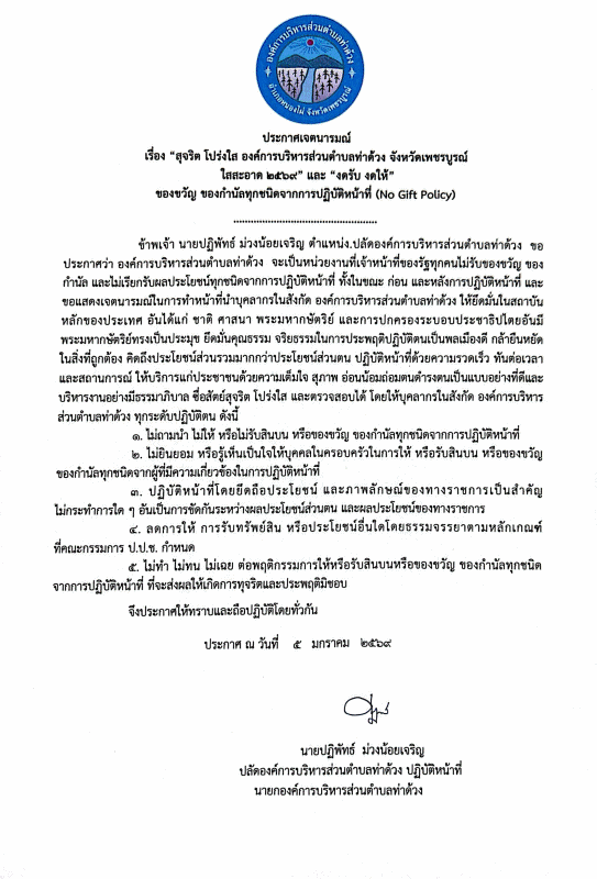 " อบต.ท่าด้วง งดรับ งดให้ ของขวัญ ของกำนัลทุกชนิดจากการปฏิบัติหน้าที่" No Gift Policy