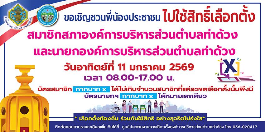ขอเชิญชวนพี่น้องชาวตำบลท่าด้วงไปใช้สิทธิ์เลือกตั้งสมาชิกสภาองค์การบริหารส่วนตำบลท่าด้วงและนายกองค์การบริหารส่วนตำบลท่าด้วง ในวันที่ 11 มกราคม 2569