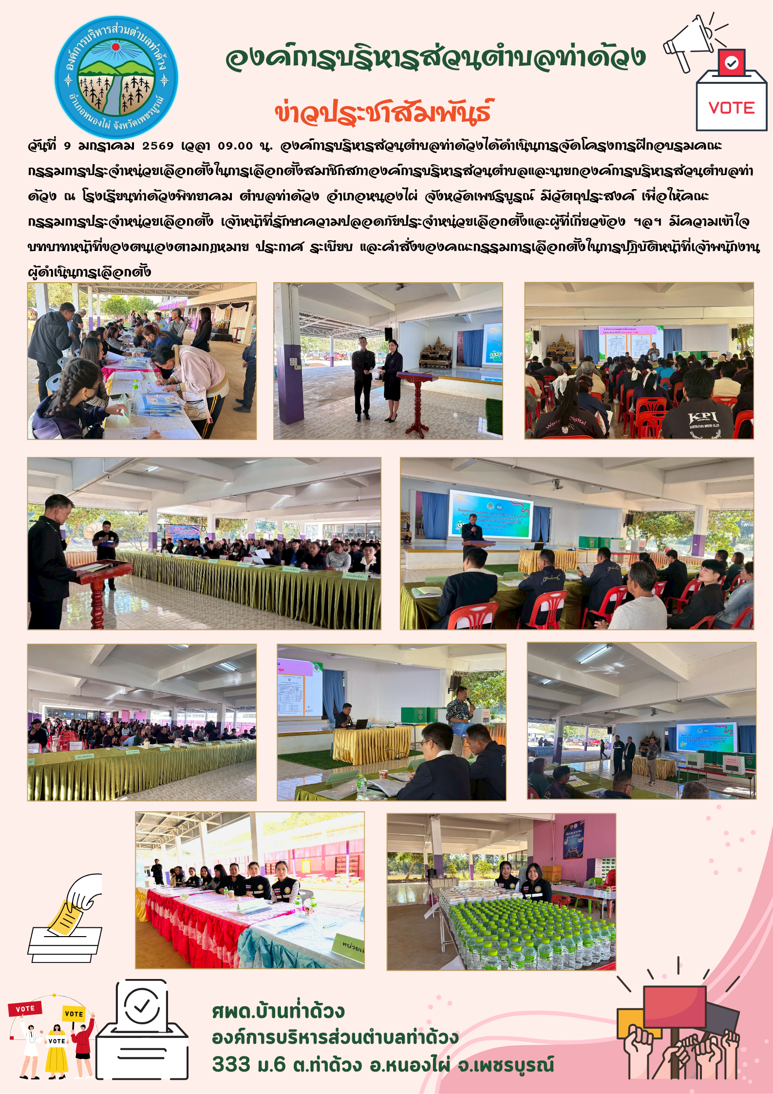 วันที่ 9 มกราคม 2569 เวลา 09.00 น. องค์การบริหารส่วนตำบลท่าด้วงได้ดำเนินการจัดโครงการฝึกอบรมคณะกรรมการประจำหน่วยเลือกตั้งในการเลือกตั้งสมาชิกสภาองค์การบริหารส่วนตำบลและนายกองค์การบริหารส่วนตำบลท่าด้วง ณ โรงเรียนท่าด้วงพิทยาคม ตำบลท่าด้วง อำเภอหนองไผ่ จังหวัดเพชรบูรณ์ มีวัตถุประสงค์ เพื่อให้คณะกรรมการประจำหน่วยเลือกตั้ง เจ้าหน้าที่รักษาความปลอดภัยประจำหน่วยเลือกตั้งและผู้ที่เกี่ยวข้อง ฯลฯ มีความเข้าใจบทบาทหน้าที่ของตนเองตามกฎหมาย ประกาศ ระเบียบ และคำสั่งของคณะกรรมการเลือกตั้งในการปฏิบัติหน้าที่เจ้าพนักงานผู้ดำเนินการเลือกตั้ง โดยมี นายปฏิพัทธ์ ม่วงน้อยเจริญ ผู้อำนวยการการเลือกตั้งประจำองค์การบริหารส่วนตำบลท่าด้วง นายนะเรศ แก่นนาค ประธานกรรมการการเลือกตั้งประจำองค์การบริหารส่วนตำบลท่าด้วงพร้อมคณะกรรมการการเลือกตั้งฯ โดยได้รับเกียรติจาก นายเด่น วิทยา รองปลัด อบต.ท่าด้วง นายนะเรศ แก่นนาค ข้าราชการบำนาญ และนายมณฑล สีหะบุตร เจ้าพนักงานป้องกันและบรรเทาสาธารณภัย เป็นวิทยากรให้ความรู้แก่คณะกรรมการประจำหน่วยเลือกตั้ง (กปน.) ผู้เข้าร่วมอบรม ประกอบด้วย คณะกรรมการประจำหน่วยเลือกตั้ง ทั้งหมด 10 หน่วยเลือกตั้ง การดำเนินโครงการอบรมในครั้งนี้ได้บรรลุไปด้วยความเรียบร้อย ทั้งนี้ทางองค์การบริหารส่วนตำบลท่าด้วงขอขอบคุณคณะกรรมการประจำหน่วยเลือกตั้งที่ได้เสียสละเวลาเข้าร่วมอบรมโครงการดังกล่าว